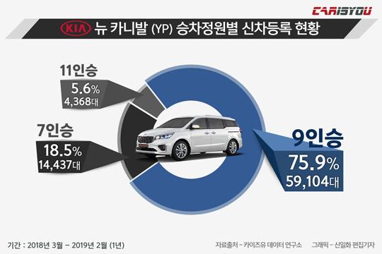 이는 인승별 판매량을 살펴보면 보다 명확해집니다. 2018년 3월부터 2019년 2월까지 판매된 카니발 7만7909대 중 11인승 비중은 겨우 5.6%에 불과했습니다(출처 카이즈유). 반면 9인승 선택은 75.9%나 됐습니다(7인승은 18.5%). 11인승이 탑승 가능 인원이 많고, 가격도 저렴하고, 세제 혜택도 좋은데도 소비자들은 9인승을 훨씬 더 많이 산다는 것이죠. 이전 그랜드 카니발 때와는 정반대입니다. 예전에는 9인승은 3열, 11인승은 4열 구조였는데, 지금은 둘 다 4열이어서 사용 환경에 별 차이가 없기 때문으로 보입니다.