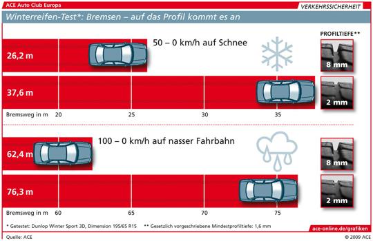 그렇다면 트레드 깊이에 따른 제동력 차이는 어느 정도일까? 독일 자동차 단체 ACE의 테스트 결과를 보면 잘 알 수 있다. 눈길에서 시속 50km/h로 달리다 브레이크 페달을 밟았을 때 트레드 홈 깊이가 8mm일 때 26.2m의 제동거리를 보였다면 트레드 홈의 깊이가 2mm인 경우 37.6m까지 늘어났다. 또 젖은 도로에서 시속 100km/h로 달리다 멈췄을 때 트레드 홈의 깊이가 8mm인 자동차는 62.4m에서 멈추지만 2mm 수준인 경우 76.3m까지 미끄러졌다.