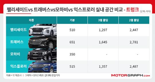팰리세이드·트래버스·모하비·익스플로러, 누가 더 넓을까