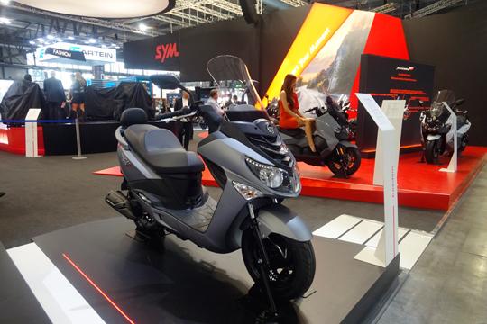 SYM은 그간의 부진을 씻고 싶어 했다. 새로운 맥심400을 공개했으며 모델 체인지된 여러 모델을 공개했다. 국내에서도 판매를 시작한 크루심125도 전시되었으며 전체적인 디자인을 다듬어 경쟁력을 확보했다. 베스트셀러 조이라이드300을 비롯해 몇몇 신기종들의 컬러를 트렌드에 맞는 그레이 컬러로 마감을 했다. 당장 큰 변형은 가지지 못하겠지만 컬러감만이라도 최신 트렌드를 따라가려는 노력이 엿보였다.