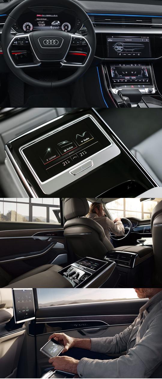 A8은 기함답게 새로운 세대로 바뀔 때마다 최신 첨단기술을 선보였다. 4세대 A8은 세계 최초로 레벨 3 자율주행 기술을 적용한 양산차 타이틀을 얻었다. 레벨 3은 사람이 개입하지 않고 조향, 가속, 감속, 추월을 할 수 있다. 운전자가 스티어링휠과 페달에 손과 발을 올려두지 않아도 된다. 중앙 운전자 보조 제어장치와 레이저 스캐너 등을 포함하는 ‘아우디 AI 잼 파일럿’이 작동하면 시속 60km 이하에서 자율주행이 이뤄진다. 국내에는 여건상 아직 적용하지 않는다.