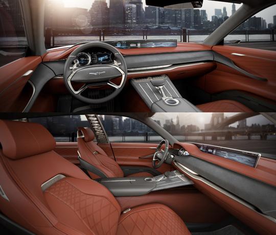 컨셉트카라는 정의와 달리 GV80의 인테리어는 다소 심심했다. 즉, 과장된 디자인 언어도 없었고 오히려 양산에 가깝게 구현한 것은 아닐까 하는 의자 디자인 등은 아쉽기만 했다. 다만, 중앙 콘솔에 위치한 넓직한 디스플레이는 향후 제네시스 실내 디자인에 디스플레이가 보다 중요한 역할을 할 것임을 알려주고 있으며, 단순하고 심심한 의자 등과 같은 인테리어 요소와 달리 숨겨진(?) 각종 공조 장치들은 특이하다 하겠다. 마지막으로, 문짝에서 문의 프레임이 없는 frameless 방식의 문짝들은 과거 2003년 당시 판매되던 그랜저의 틀없는 문은 물론 최근 마세라티의 르반테와 동일한 방식이다.