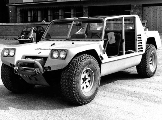 오프로더라고는 한 번도 만들어본 적이 없는 람보르기니는 개발과 영업을 MTI에 맞기는 대신 돈을 대고 나중에 잘 되면 생산을 맡는 물주의 역할을 맡았다. 딱히 요구사항조차 없던 상황에서 군용 오프로더의 특성을 감안한 개발 일체가 미국에서 진행되었고, 그 결과물이 1977년에 치타(Cheetah)라는 이름을 달고 등장한다. 강관프레임 섀시에 FRP 보디를 씌운 차는 특이하게도 엔진과 변속기가 뒤에 달린 풀타임 4륜구동 방식을 취했다. 자사의 엔진 대신 쓴 ‘미국제’ 크라이슬러 V8 OHV 엔진은 미군의 마음에 들어 보려는 발버둥에 가까웠다.