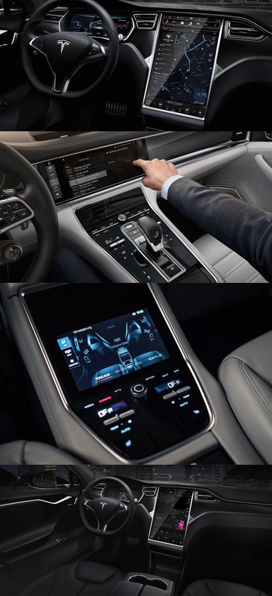 모델S 실내에서 가장먼저 눈에 띄는 것은 거대한 17인치 터치스크린이다. 이 터치스크린으로 거의 모든 것을 할 수 있다. 이 거대한 스크린은 처음 보면 어리둥절할 수 있으나 곧 익숙해진다. 유일한 불만이라면 몇몇 아이콘이 작은 것과 이동 중 누르기 힘들다는 점 정도이나 이마저도 다른 자동차 제조사의 최신 차량 스크린 UX에 비해서 갤럭시S3 스마트폰과 갤럭시S6스마트폰의 차이 정도 수준의 응답성과 디자인 완성도의 차이가 느껴질 만큼 뛰어나다.