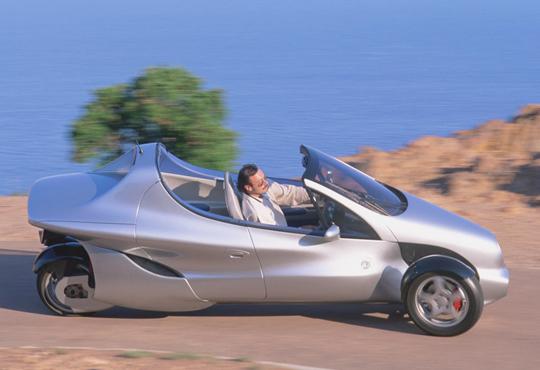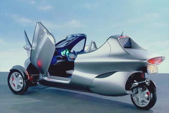 1997년 프랑크푸르트 국제 모터쇼에서 등장한 메르세데스-벤츠의 F300 ‘라이프 제트(Life Jet)’ 콘셉트는 자동차와 모터사이클의 교집합을 꿈꿨다. 디자인이 정말 특이하다. 개인용 제트기를 테마로 꾸민 디자인은 공기역학적으로 우수하지만 일반적인 자동차 모양이 아니다보니 생경하다. 뒷모습은 완전히 스쿠터를 닮았다.