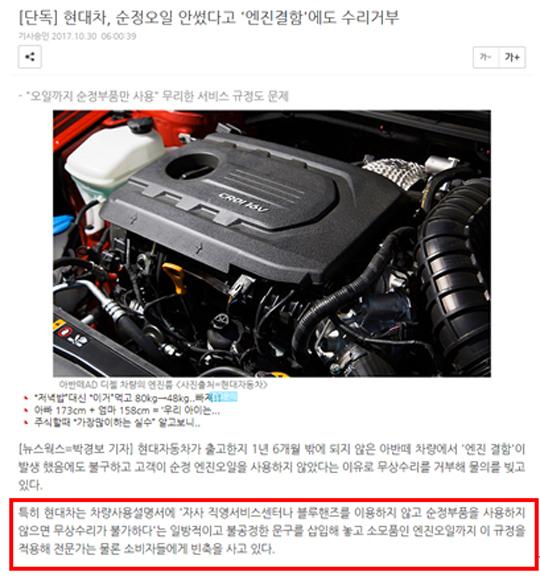 [이준노의 자동차 라이프] 최근 현대 아반떼AD 소유자가 제기한 엔진손상 결함에 대해 현대자동차에서 순정 엔진오일을 사용하지 않았다는 이유로 보증수리를 거부했다는 뉴스가 보도됐다. (관련기사: http://www.newsworks.co.kr/news/articleView.html?idxno=145030)