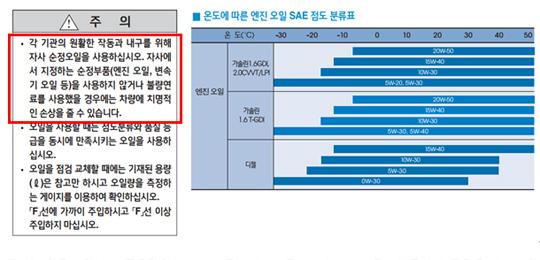 이렇게 제조사가 제시하는 권장엔진오일 규격에서 “한끝차이”라도 있는 엔진오일을 사용하는 것은 내 차량 손상 가망성을 크게 높일 수 있는 위험이 있으며, 보증수리 시에도 분쟁에 휘말릴 가망성이 매우 높다.