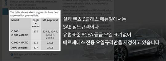 벤츠의 매뉴얼의 호환 엔진오일 표시. ACEA나 SAE 표준을 제시하지 않고, 자사의 독자적인 규격(MB Approval)을 요구하고 있다. 이런 경우라도 자사의 순정 엔진오일 뿐만 아니라, MB Appeoval을 받은 모든 엔진오일을 사용할 수 있음을 의미한다.