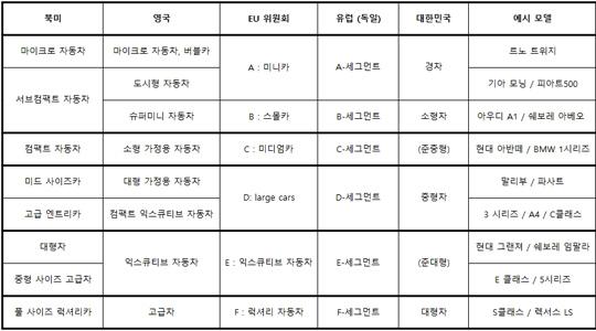 ‘동급에서 가장 큰 사이즈’라는 표현을 가끔 보게 되는데 여기서 동급은 바로 같은 차종을 의미한다. 예를 들어 기아 K5와 르노삼성 SM5는 같은 급이고 미니와 아우디 A1 역시 같은 급이다. 그런데 이 차급 분류는 북미와 유럽, 오세아니아가 다르고, 유럽 중에서도 다시 유럽 대륙과 영국이 서로 조금씩 달리하고 있다. 우리나라의 경우 언론을 비롯해 일반적으로 업계에서는 유럽에서 사용하는 세그먼트 방식을 가져다 쓰고 있다.
