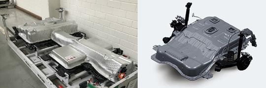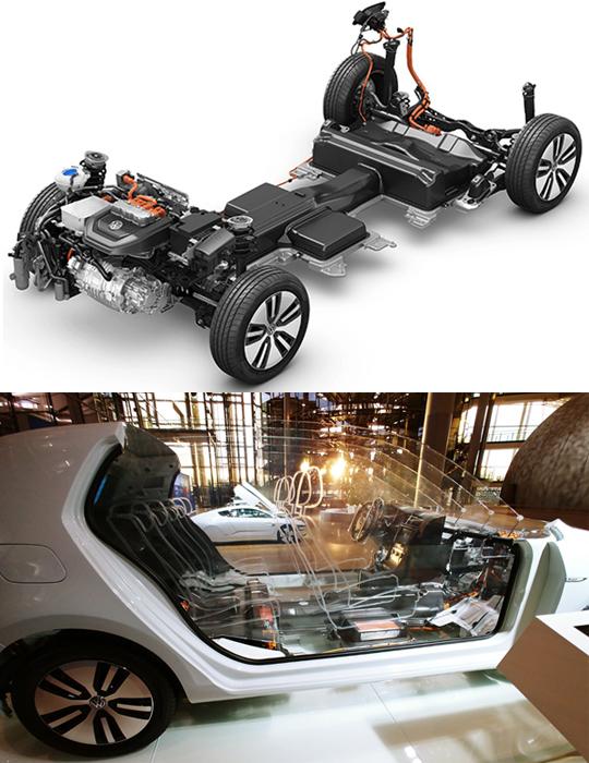 사진 왼쪽이 e-골프의 배터리팩, 오른쪽은 아이오닉EV의 배터리팩. 두 배터리팩의 전체 부피는 비슷한데, e-골프는 리어액슬의 안쪽 연료통공간과 후석 시트, 센터터널, 전면시트아래, 그리고 기어박스공간까지 자투리공간을 풀로 채워 만들어졌고, 아이오닉은 리어액슬 안쪽의 연료통공간과 리어액슬 뒤쪽의 트렁크 스페이터이어 공간을 채우는 배치이다. 그 결과 e-골프의 전후 무게 밸런스와 주행성능이 현대 아이오닉에 비해 월등히 뛰어나게 되었다. 또한 EV전용 섀시설계의 BMW i3에 비해서도 약점이 되지 않는 적절한 전 후 무게배분을 갖고 있다.