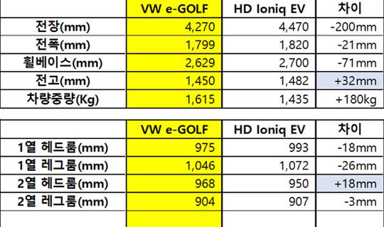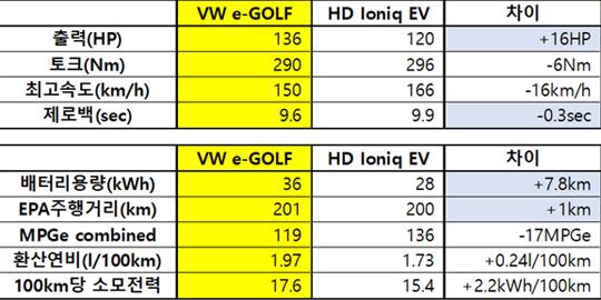 e-골프는 36kWh 배터리 탑재로 아이오닉에 비해 29%나 더 큰 용량을 갖추었으나, 1회 충전 주행거리는 거의 비슷하여, 전비는 15% 정도 떨어진다. 이는 180kg 무거운 무게, 아이오닉보다 떨어지는 공력성능, 그리고 냉난방공조장치의 전력소모량이 아이오닉보다 많기 때문이다.