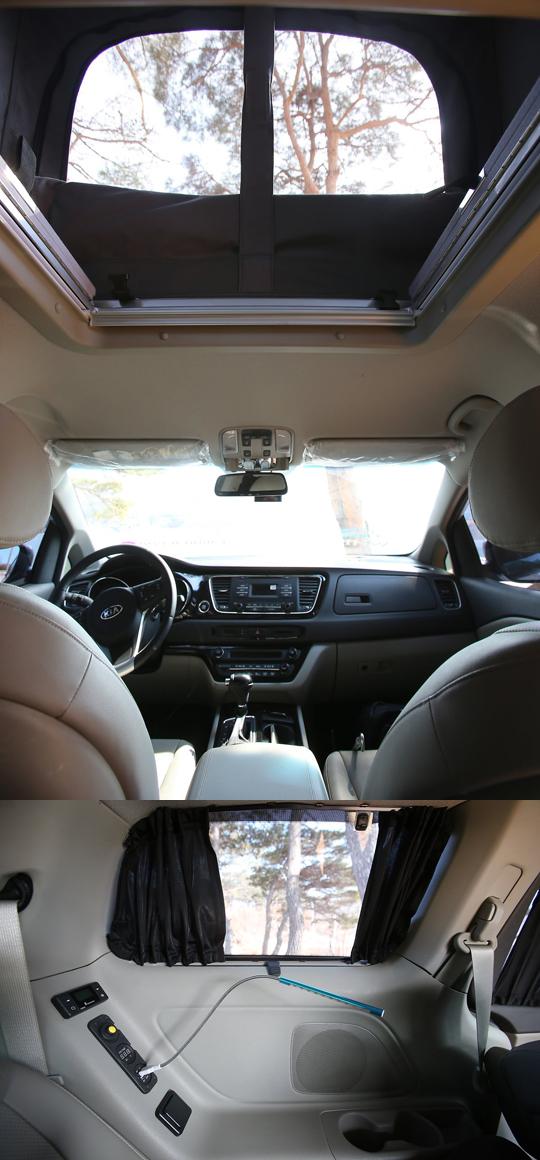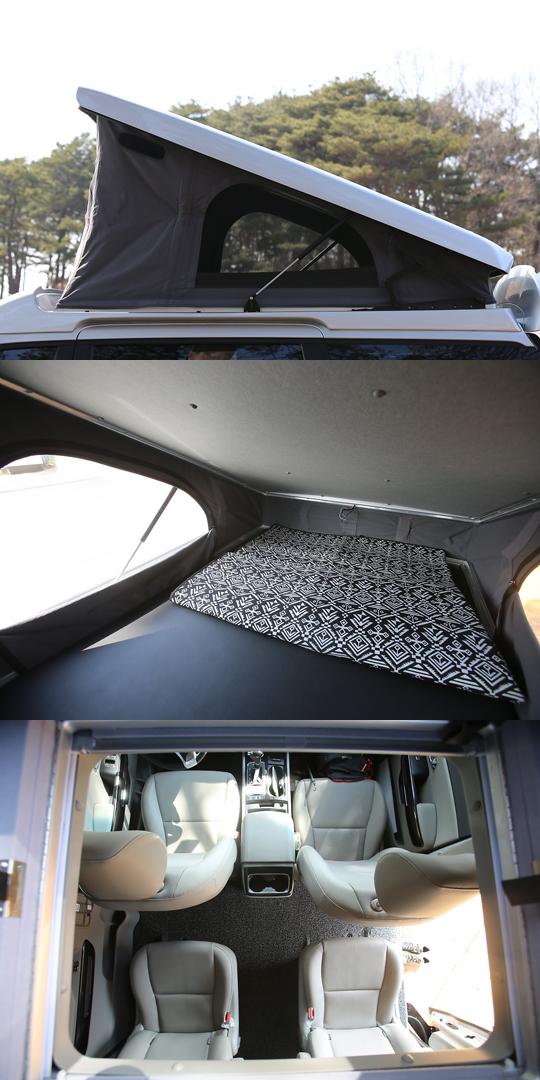 카니발 팝업이란 모델이 대표적이다. 평상시에는 승용으로 타고 다니면서 주말에 레저를 보다 적극적으로 즐기도록 고안했다. 차박과 비슷하겠지만, 관건은 얼마나 편안하게, 때론 운치 있게 잘 수 있느냐 하는 점이다. 일체형 팝업 텐트로 해결했다. 루프탑 텐트를 그냥 얹는 수준은 아니다. 팝업 텐트와 지붕을 연결하고 보강해 일체감을 높였다. 선루프 위치에 철판을 오려내고 바닥판을 보강해 통로도 만들었다. 다락방처럼 활용하는 재미가 있다. 보통 루프탑 텐트는 외부에서 들어가야 하니 개념이 다르다. 일체형으로 만들었기에 소음도 적다.