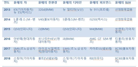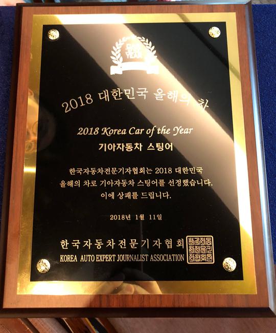 우리나라에서는 한국자동차전문기자협회(회장 하영선)가 가장 먼저 기아자동차 ‘스팅어’를 ‘2018 올해의 차’로 뽑아 시상까지 마쳤다. 협회는 “스팅어가 불모지나 다름없던 국내 자동차 시장의 퍼포먼스 세단을 성공적으로 개척했고, 상품성도 뛰어나 올해의 차로 선정하게 됐다”고 시상의 배경을 설명했다. 스팅어는 대상격인 ‘올해의 차’뿐만 아니라 ‘올해의 디자인’까지 받아 2관왕에 올랐다.