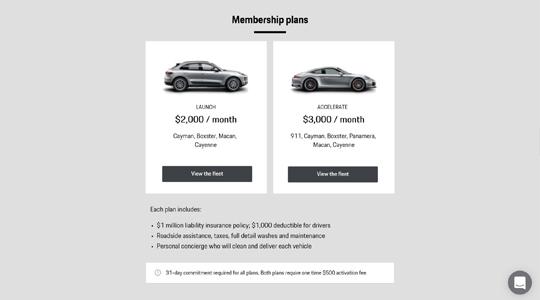 포르쉐 미국 법인이 애틀란타에서 시범 운용 중인 포르쉐 패스포트(Porsche Passport)는 론치(Launch)와 액셀러레이터(Accelerate) 두 가지 상품으로 구성된다. 월 구독료 2000달러의 론치 구독자는 718 박스터와 카이맨 S, 마칸 S와 카이엔 등을 바꿔 탈 수 있다. 매달 3000달러짜리인 액셀러레이터 구독자는 여기에 911 카레라 S, 파나메라 4S, 카이엔 S E-하이브리드 등이 포함된 22개 차종의 이용이 가능하다.