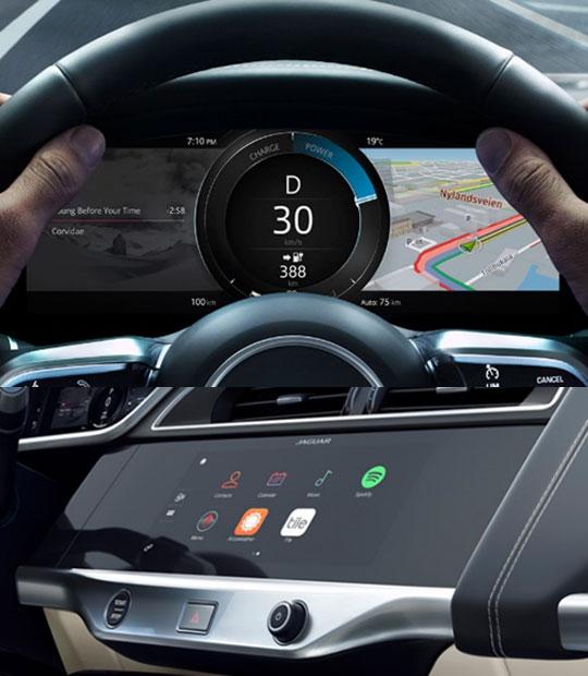 미래를 대표하는 재규어의 전기차답게 커넥티비티 관련 스마트 기술이 다량으로 선보이는 점 또한 주목할 만하다. 우선 Touch Pro Duo 인포테인먼트 시스템은 대시보드에 통합된 10인치 터치스크린과 아래쪽의 5인치 터치스크린, 다기능 다이내믹 다이얼로 구성되어 직관적으로 차량과 운전자간의 대화를 가능하게 하고 있는데 애플 및 안드로이드 스마트폰과 호환되는 Remote 앱은 연결 기능을 제공하는 동시에 주행 가능 거리, 충전 상태, 충전 비율, 플러그 상태 등의 주요 차량 정보와의 상호작용을 지원하고 Connect Pro를 통해 운전자에게 다양한 최신 정보를 제공하고 있으며 이동 경로, 근처의 주차장 및 관심 지점에서 어떤 일이 일어나는지 알 수 있고, 차내 4G 와이파이 핫스팟을 활용하여 언제나 인터넷과 연결이 가능하다.