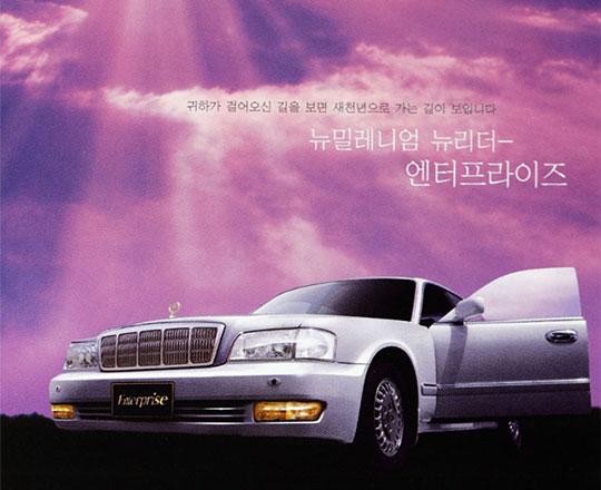 기아자동차에서 진정한 플래그십을 이야기할 때 가장 먼저 떠오르는 것은 1997년에 나왔던 엔터프라이즈다. 1997년 3월 판매를 시작한 엔터프라이즈는 ‘한국대표(韓國代表)’라는 타이틀을 달고 나온 당대 최고의 정통 후륜 구동 대형 세단이었다. 당시 국산 승용차 최대 배기량인 V6 3.6L 230마력 엔진을 얹었고, 역시 국산차 중에서 가장 빨랐던 최고시속 230km를 내 말 그대로 최고의 차였다.