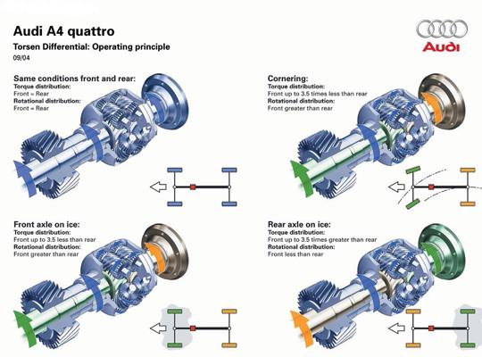 그 핵심에는 토르센(Torsen) 센터 디퍼렌셜이 있었다. 웜과 웜 기어의 원리를 이용하는 토르센 기어를 이용한 콰트로 시스템의 센터 디퍼렌셜은 디퍼렌셜 기어의 역할과 구동력 분배 기능을 기구 하나로 모두 처리할 수 있었다. 토르센 센터 디퍼렌셜은 느리게 도는 쪽이 접지력이 좋은 것으로 생각하여 구동력을 더 보내는 특징을 이용한다. 즉 어른 주먹만한 토르센 기어를 센터 디퍼렌셜로 사용한 아우디 콰트로 시스템은 가장 간결하면서도 가장 바람직하게 작동하는 이상적인 4륜 구동 시스템을 완성한 것이었다.