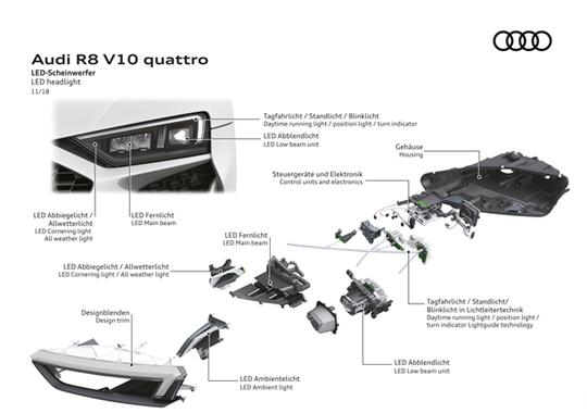LED 헤드램프 역시 아우디가 트렌드를 주도했다. 2003년 북미국제오토쇼에 선보인 파이크스 피크 콘셉트카에 LED 안개등을 선보였다. 같은 해 제네바모터쇼에 등장한 누볼라리 콰트로 콘셉트카와 프랑크푸르트 모터쇼에 나온 르망 콰트로 콘셉트카에 LED 헤드램프를 집어넣었다. 2005년에는 실제로 완벽하게 작동하는 LED 헤드램프를 올로드 콰트로 콘셉트카에 적용했다. 양산차에 상향등과 하향등 모두 LED를 넣은 풀 LED 헤드램프를 도입한 브랜드도 아우디다. 2008년 아우디 R8 V10은 세계 최초로 풀 LED 헤드램프를 달고 나왔다.