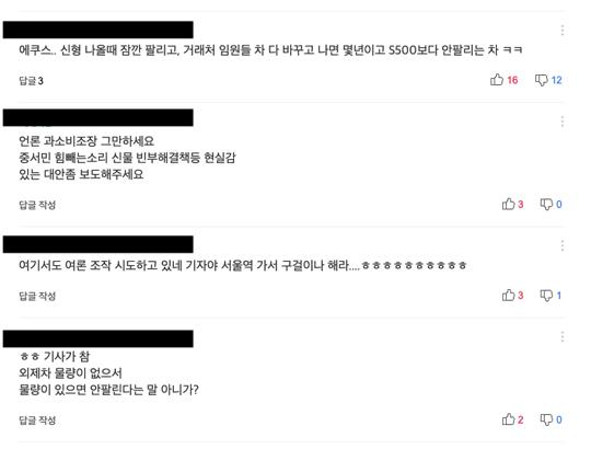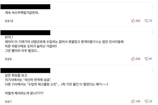 역시나 좋지 않은 댓글이 달렸네요. ‘에쿠스(EQ900).. 신형 나올 때 잠깐 팔리고, 거래처 임원들 차 다 바꾸고 나면 (벤츠)S500보다 안 팔리는 차’라는 글과 ‘연말연초에 수입차는 없어서 못 팔았고, 현대기아차는 법인 인사이동에 따른 차량 구매로 숫자가 늘어난 거잖아’라는 글이 명치를 깊게 때립니다.