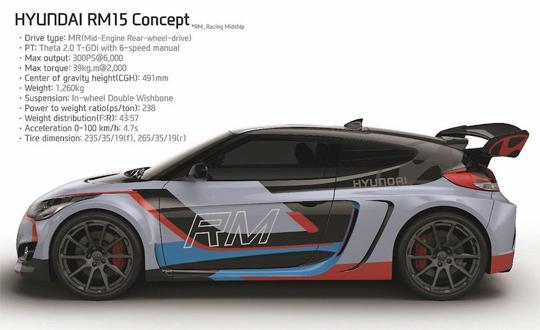 시작은 ‘2014년 부산모터쇼’에 나온 ‘벨로스터 미드십’ 쇼카였습니다(차체에 RM이라고 쓰여 있음). 당시 현대차는 “미드십은 포르쉐 등 고성능 스포츠카 브랜드에서 사용하는 엔진 구조로, 엔진을 차체 중앙에 탑재해 무게 균형이 뛰어나다는 장점이 있다”면서 “벨로스터 미드십 콘셉트카를 통해 현대차의 고성능 모델에 대한 미래를 볼 수 있는 기회를 제공하겠다"고 설명했습니다.