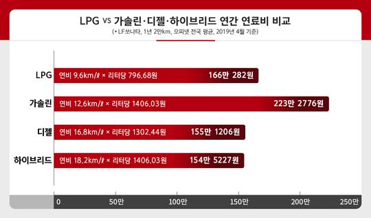 LF 쏘나타 LPG 모델의 복합 연비는 9.6km/l입니다. 1년에 2만km를 달리면 약 2084리터가 필요합니다. LPG 가격이 796.68원/l이니 총 166만282원이 듭니다.