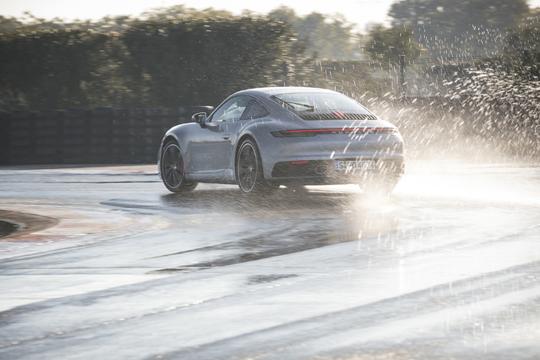 실제로 새로운 911의 웻 모드를 젖은 서킷에서 수차례에 걸쳐 테스트해봤다. 결과적으로 이야기하면 아주 매끄럽고 효율적이다. 비오는 날 트랙에서 숨겨둔 무기로 사용하기에 적절하다. 젖은 노면에서 스포트 모드로 달리는 것은 짜릿하지만 낭비가 많다. 미끄러지는 것이 즐겁지 않는 운전자에게는 대단한 모험이다. 하지만 젖은 노면 주행 모드로 바꾸는 동시에 많은 것이 바뀐다. 엔진 토크가 확실히 부드러워지는 것을 느낄 수 있다. 8단 듀얼클러치 변속기도 평소보다 느긋하게 반응한다.