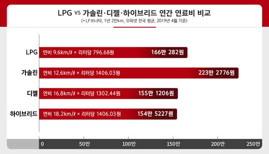 이는 저렴한 연료비로 충당할 수 있습니다. 여러 가지 제기되는 문제점에도 LPG 차량이 주목받는 이유는 저렴한 연료비로 인한 경제성 때문이죠. 실제로 LPG 차량(LF쏘나타 기준)을 1년 2만km 주행했을 경우, 가솔린 모델이 비해 연간 약 58만원의 연료비를 아낄 수 있습니다. 주행을 오래 할수록 절약할 수 있는 연료비는 늘어나겠네요.
