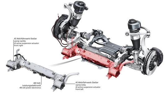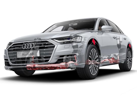 A8의 풀 액티브 서스펜션은 센서부와 작동부 모두에서 기술적, 사상적으로 진일보한 특징을 보여준다. 가속도 및 서스펜션 스트로크 센서들을 사용하는 종래의 액티브 서스펜션에 더하여 A8은 반자율주행 시스템용 모빌아이 사의 카메라를 이용하여 전방 5~20미터의 노면 요철을 읽는다. 에어 서스펜션으로는 대응하기 힘든 민첩한 서스펜션 높이 조절을 위하여 유압에 의존하던 종래의 시스템에 비하여 A8은 48볼트 시스템을 이용하는 전기 모터로 유압으로는 불가능한 매우 강력하면서도 민첩한 동작을 실현한다. 즉 A8의 풀 액티브 서스펜션은 반자율주행 시스템과 48볼트 마일드 하이브리드 시스템이라는 미래차의 현실적 솔루션과 이미 체제 수준에서 연결되었다는 것이다. 사상 자체가 미래적이다.