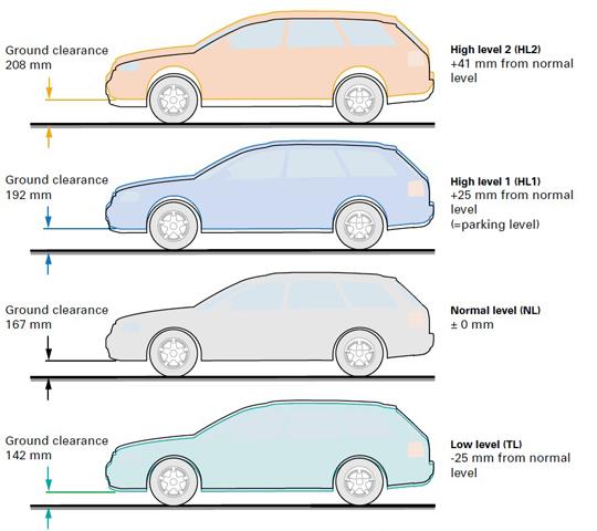 이 초보적인 높이 조절식 서스펜션이 큰 발전을 이룬 것은 아우디가 선보인 오프트 오프로더 크로스오버 모델인 올로드 콰트로(allroad quattro)에서였다. 비록 올로드 콰트로가 왜건 기반의 소프트 오프로더의 최초 모델은 아니었다. 하지만 스포츠 왜건의 우수한 조종 성능과 고속 안정성, 오프로더의 주파성능을 거의 완벽하게 함께 실현한 의미 있는 모델이었는데 그 핵심이 올로드 콰트로의 4 레벨 에어 서스펜션이었다.