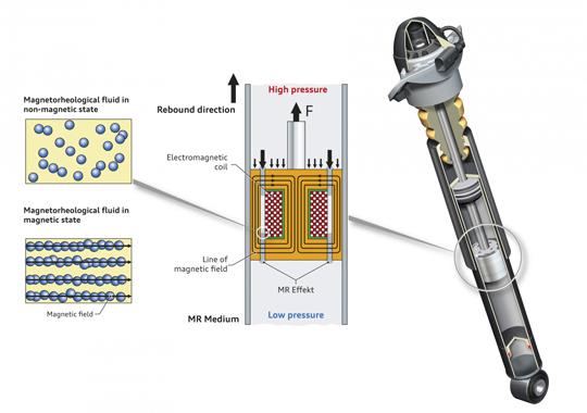 그래서 아우디는 이른 시기에 다른 방식을 도입한다. 바로 2세대 아우디 TT가 도입한 ‘아우디 마그네틱 라이드’다. 이 장치의 핵심은 자기유동유체, 즉 자성에 따라 유동성이 변화하는 유치를 유압액으로 사용하는 것이다. 즉 유압액의 통로를 조절하는 기존 방식과는 달리 유압액 차체의 ‘끈끈함’이 변하는 원리를 사용하는 것이다. 따라서 이 방식은 밸브에 조절 장치가 없으므로 움직이는 부품이 없다. 또한 기계적으로 작동하는 밸브에 유압 오일이 저항을 받으며 특성을 만드는 유압식에 비하여 비교도 되지 않을 정도로 빠른 수십만분의 일초 단위의 민첩성을 갖는다. 내구성과 응답성 모두를 잡은 것이다. 이 방식은 민첩성이 중요한 컴팩트 스포츠 모델인 TT나 궁극의 예리한 조종 성능을 발휘해야 하는 R8 등 경량 및 스포츠 모델들에 주로 사용되고 있다.