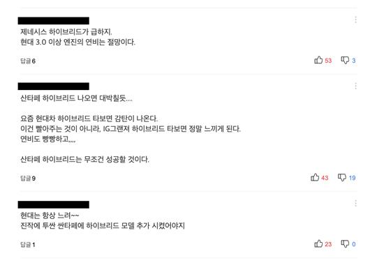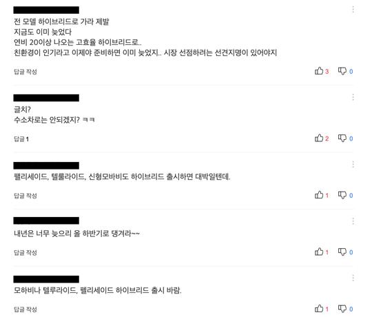 꽤 긍정적인 댓글이 달렸습니다. 베스트 댓글은 ‘(싼타페·쏘렌토보다는)제네시스 하이드리드가 급하지, 현대차의 3.0 이상 엔진의 연비는 절망이다’였지만, 대부분은 ‘싼타페 하이브리드 나오면 대박칠 듯, 요즘 현대차 하이브리드 타보면 감탄이 나온다’라거나 ‘진작에 투싼과 싼타페에 하이브리드 모델을 추가시켰어야지’ 등 호의적인 반응이었습니다. 지금도 늦었으니 더 빨리, 더 많은 모델에 하이브리드 라인업을 추가하라는 것이지요.