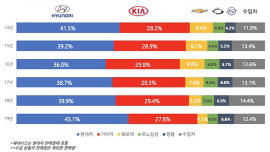 현대차의 판매량은 최근 몇 년간의 하락세를 벗어나 회복하는 모습입니다. 우선 내수 점유율이 굳건합니다. 내수 시장에서 얻는 이익이 현대차의 이익 대부분을 차지한다는 루머는 국내 공장의 수출분 등 해외 이익의 국내 이전분에 대한 오해에서 비롯된 것이긴 하지만 어쨌건 내수 시장은 현대차에게 든든한 보루입니다. 2016년만 하더라도 치열한 경쟁이 전개되던 국산 자동차 시장은 어느새 다시 현대차와 기아차의 독주 모드이며 거기다 수입차 역시 폭스바겐, 아우디 등이 몇 년 동안 주춤하며 현대차의 내수 점유율은 다시 상승세입니다.