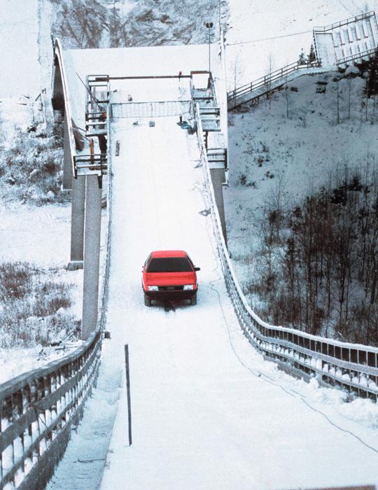 아우디 콰트로는 랠리에서 실력을 발휘하고 승용 모델로 이식됐다. 이때 사람들에게 각인시키는 기발한 방법도 시도했다. 이제는 너무도 유명한 1986년 스키 점프대 광고다. 아우디 100 CS가 스파이크 타이어만 신고 스키 점프대를 올랐다. 승용차 타고 스키 점프대에 오를 이유 따윈 없다. 하지만 아우디는 스키 점프대로 자동차를 내몰았다. 덕분에 아우디 콰트로를 어떤 설명보다 확실하게 사람들 뇌리에 각인시켰다.