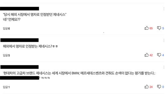 ‘제네시스, 하반기 첫 SUV GV80 출격..2020년 6개 라인업 완성’이라는 기사에 달린 댓글을 보면 제네시스에 대한 국내 소비자들의 반응은 그리 좋지 않은 듯합니다. 특히, 해외 시장에서 명차로 인정받았다는 내용, BMW 및 벤츠와 견줘도 손색없다는 평가를 받았다는 내용에 반발하는 댓글이 많았습니다.