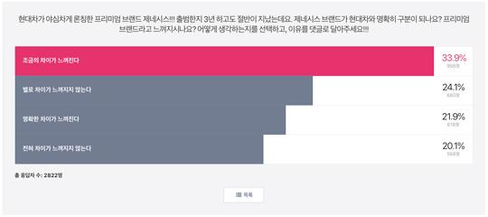 소비자들이 제네시스 브랜드에 대해 어떻게 생각하는지 설문조사를 해봤습니다. ‘현대차와 제네시스, 브랜드의 차이가 느껴지나요?’라는 주제로 5월 2일부터 5월 16일까지 진행했는데요, 총 2822명이 응답을 해주셨습니다.