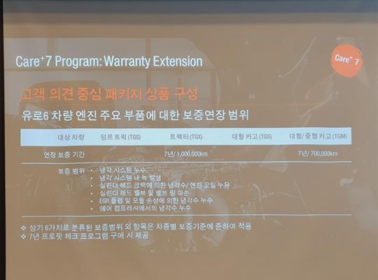 ‘주행거리가 긴 트랙터 고객과 고부한 운행이 많은 덤프트럭 고객, 그리고 매우 다양한 카고 트럭의 주행 환경을 어떻게 한 가지 조건으로 커버할 수 있는가? 일부 고객에게 불만이 있지는 않은가?’라는 제 질문에 ‘다양한 고객들을 담으려면 그릇을 크게 만들면 됩니다’라는 심플한 답변이 있었습니다. 100만km는 7년에 대략 90만km 주행하는 트랙터를 위한 조건이고 7년은 솔직히 덤프트럭으로서는 매우 넉넉하게 본 수명이라는 설명이 뒤따랐습니다.