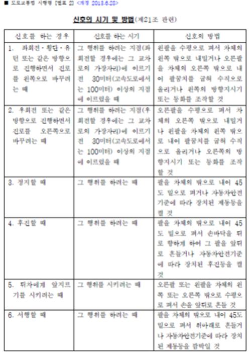 참고로 아래와 같이 도로교통법 시행령 별표 2에는 도로에서 상황에 맞게 방향지시등과 같은 등화류와 운전자의 손짓으로 소통하는 방법이 규정되어 있습니다. 다시 한 번 말씀드리지만 법에서 정한 것은 최소한의 약속이니 꼭 지켜야 합니다.