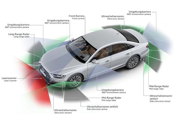 지난 2017년 아우디는 4세대 A8을 내놓으면서 양산차 최초로 레벨 3 자율주행 기술을 선보였다. 레이저 스캐너(라이다)는 자율주행의 핵심 부품으로 꼽히지만 가격이 비싸서 양산차에는 적용하기 쉽지 않았다. 아우디는 A8에 양산차 처음으로 레이저 스캐너를 도입했다. 센서들은 빈틈없이 차 사방 정보를 수집한다. 레이다는 전방 상황을 파악하고 초음파 센서와 카메라는 주변을 살핀다. 레이저 스캐너는 자동차나 물체와 보행자 등 주변 상황을 정밀하게 파악한다. 이들 센서가 수집한 정보는 중앙 운전자 보조제어 장치가 통합해서 컨트롤한다. AI 트래픽 잼 파일럿 같은 첨단 자율주행 기술을 비롯해 AI 리모트 파킹 파일럿, AI 리모트 개러지 파일럿 등 첨단 기능이 각종 센서에 의해 이뤄진다.
