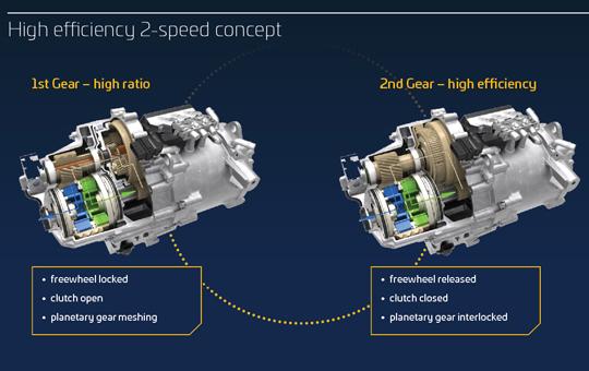 e트위스터는 토요타 프리우스의 유성기어처럼 전기 모터에 직접 연결하는 구조다. 하지만 두 번째 유성기어(서로 다른 크기의 태양 기어 두 개와 결합된 두 세트의 유성기어)를 통해 두 개의 기어비가 제공된다. 첫 번째 기어비(17:1)는 저속 토크를 끌어내기 위함이다. 비교적 힘이 부족한 작은 모터에서도 충분한 가속력을 끌어낼 수 있다. 두 번째 기어비(10:1)는 고속에서 차의 속도를 효과적으로 높이는데 도움을 준다. 실제로 이 기술이 사용된 테스트카를 타보면 두 기어비를 교차하며 변속하는 것을 전혀 알아차릴 수 없다고 한다.