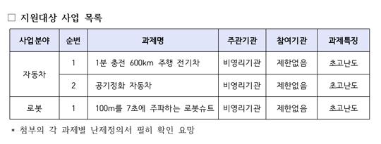 확인했더니 1분 충전으로 600km 주행하는 전기차가 나온 게 아니라 정부가 이런 기술 개발을 위해 7년간 1600억원을 지원한다는 기사였습니다. 이름하여 ‘알키미스트(연금술사) 프로젝트’로, 1분 충전으로 600㎞를 주행하는 전기차를 비롯해 100m를 7초에 주파하는 로봇 슈트, 유리창 형태의 투명한 태양전지, 카르노 효율 한계에 근접한 히트 펌프, 이론상의 한계 효율을 극복한 슈퍼 태양전지, 공기 정화 자동차 등 6가지 과제를 공고한 후 지원자를 모집하는 것이었습니다.