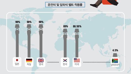 안타깝게도 우리나라 안전벨트 착용률은 다른 선진국에 비해 매우 낮습니다. 에어백 개수와 사양에 대해서는 그렇게 중요하게 생각하면서 정작 안전벨트는 잘 매지 않는 게 현실입니다. 특히, 뒷좌석으로 갈수록 안전벨트 착용률은 현저하게 떨어집니다.