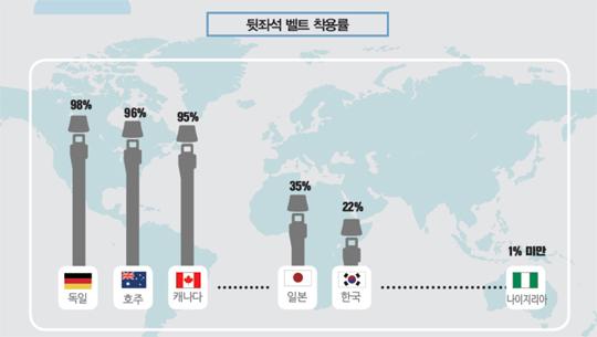 국가정보DB센터(OECD Road Safety Annual Report 2016)에 따르면 국내 뒷좌석 안전벨트 착용률은 겨우 22%밖에 되지 않더군요. 독일과 호주, 캐나다(95~98%)와 큰 차이를 보입니다. 일본도 35%로 낮은 편인데, 우리나라는 더 낮네요.